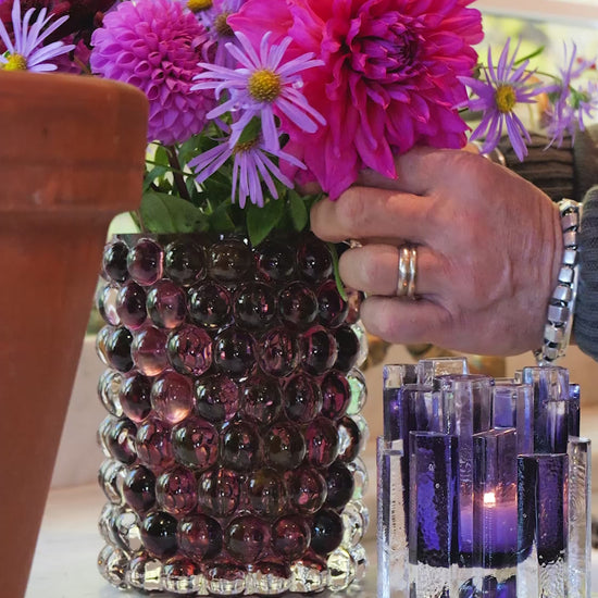 Hurricane Boule wird in Böhmen, der Heimat der weltbesten Glasbläser, mundgeblasen. Die Blasen, die in einer gusseisernen Form hergestellt werden, verleihen Hurricane Boule sein eigenes, einzigartiges optisches Muster und ein luxuriöses, schweres Gefühl. Kombiniert mit Boule Regular und Boule Mini in einer Reihe von Farben schafft das Set eine erstaunliche Tischdekoration. Boule Large kann auch einzeln als schöne Blumenvase präsentiert werden.