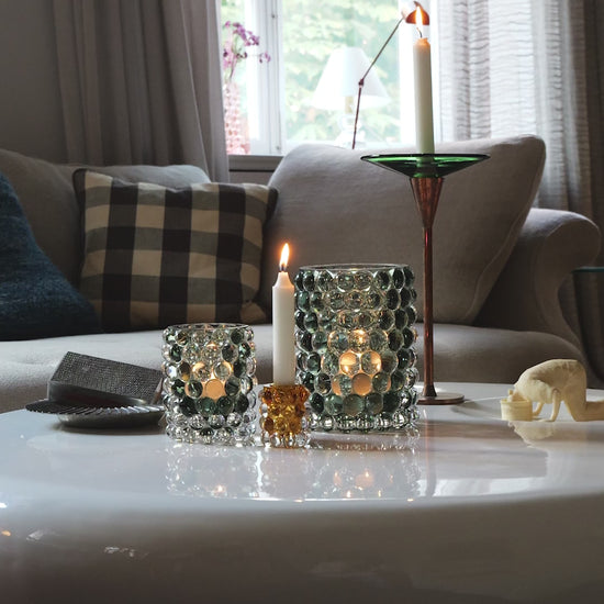 Hurricane Boule wird in Böhmen, der Heimat der weltbesten Glasbläser, mundgeblasen. Die Blasen, die in einer gusseisernen Form hergestellt werden, verleihen Hurricane Boule sein eigenes, einzigartiges optisches Muster und ein luxuriöses, schweres Gefühl. Kombiniert mit Boule Regular und Boule Mini in einer Reihe von Farben schafft das Set eine erstaunliche Tischdekoration. Boule Large kann auch einzeln als schöne Blumenvase präsentiert werden.